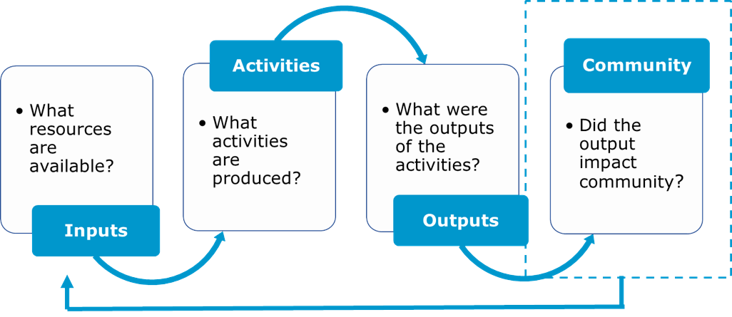 Activities comprise the enterprises and production processes that combine two or more community input resources. For example, it may take human resources (e.g., skills and experience), economic resources (e.g., funding), and built resources (e.g., a skateboard park) to develop and operate a program that offers free skateboard lessons for youth at risk.